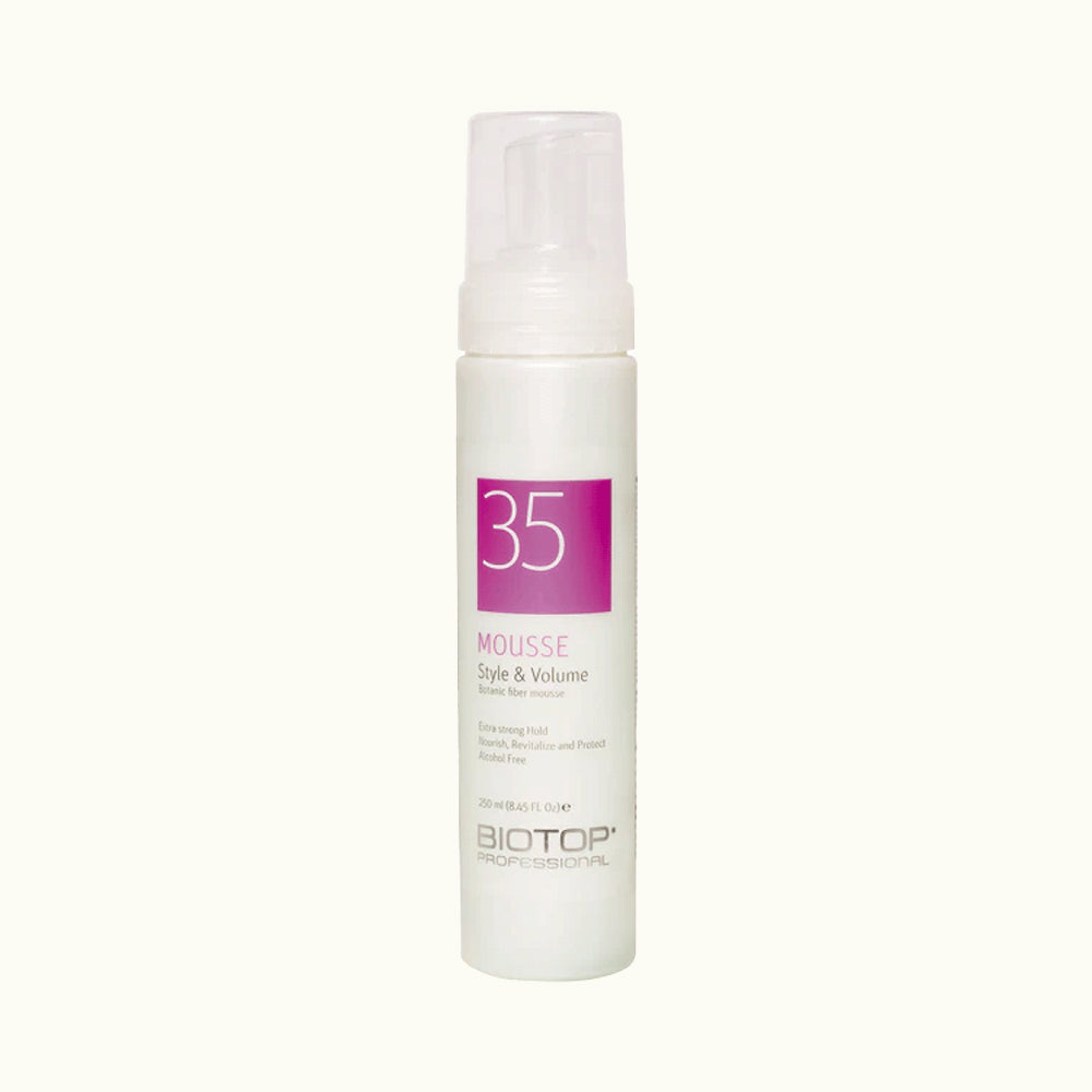 - Apply 3-4 pumps of BIOTOP PROFESSIONAL 35 FIBER MOUSSE to towel-dried hair and style with fingertips, starting from the tips of the hair, lifting hair up toward the roots.