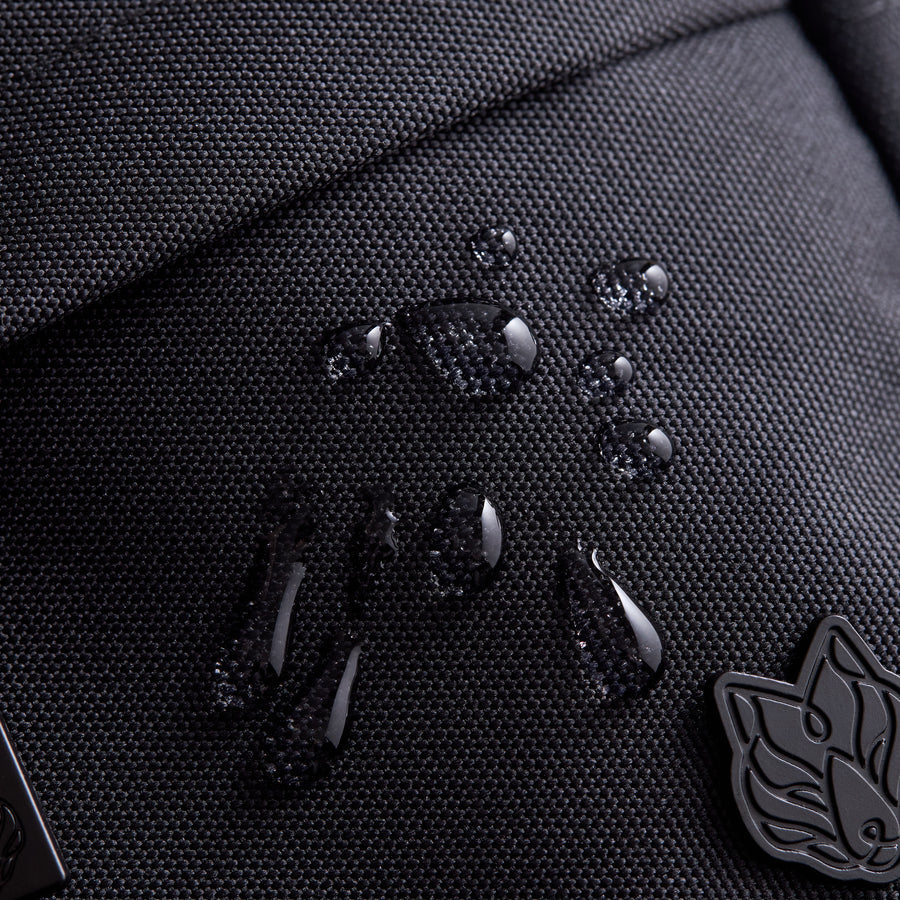 - Custom matte black metal logo zippers throughout