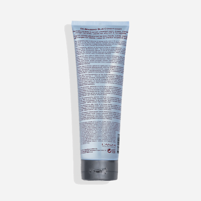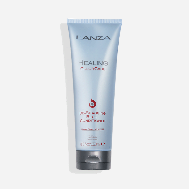 L'ANZA Healing ColorCare De-Brassing Blue Conditioner eliminates unwanted warmth and brassiness in the orange to orange-red range. Ideal for medium brunettes and darker.