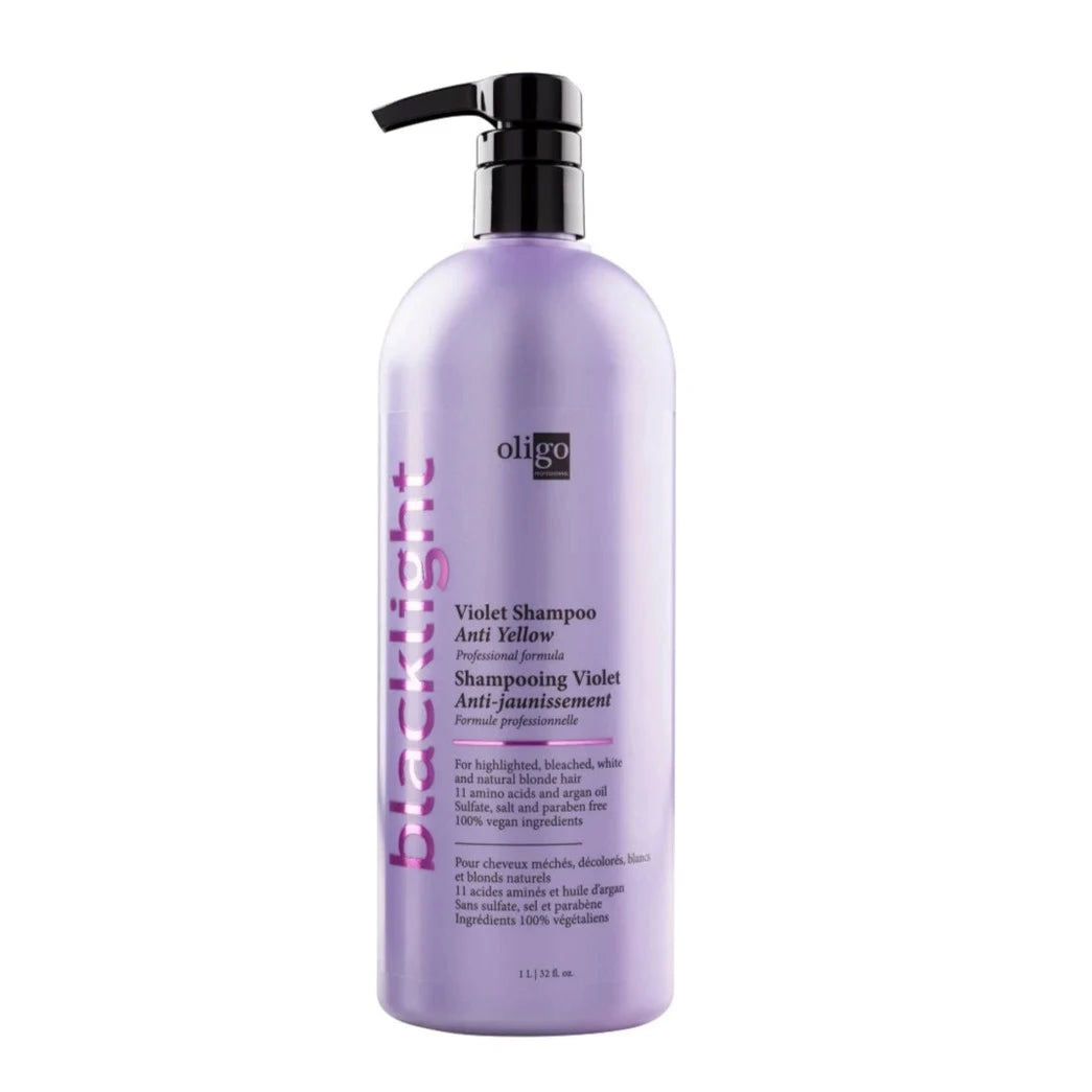 Blacklight’s Violet Shampoo, formulated for highlighted, bleached, white and natural blonde hair, eliminates yellow tones, brassiness and refreshes faded highlights leaving hair looking cleaner and brighter. Its unique formula, enriched with 11 amino acids and argan oil, moisturizes, strengthens hair structure and repairs surface damage while increasing shine and colour retention.