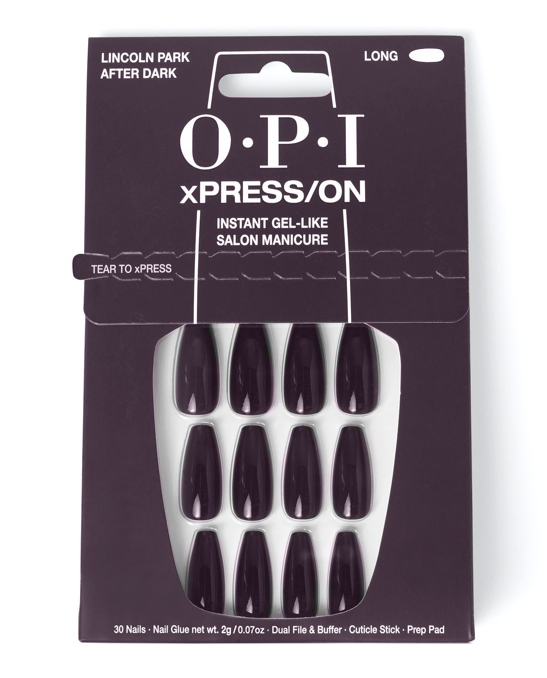 Vamp it up with these enchanting midnight purple press-on nails. These classic near-black purple press-ons come in a longer length with coffin-shaped tips. Each xPRESS/ON nail kit puts professional quality shades, nail art designs, or innovative nail effects at your fingertips. Create your own custom look by mixing and matching different colors and designs. Each set includes nail glue, a cuticle stick, a dual nail file and buffer, an OPI prep pad, and 30 nails in different mani sizes to fit you perfectly. Your OPI xPRESS/ON kit gives you 14 days of head-turning wear.