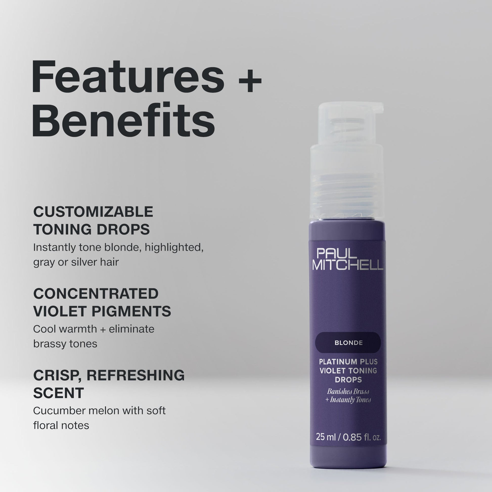 Instantly tone blonde, highlighted, grey or silver hair with Paul Mitchell Platinum Plus Violet Toning Drops. These customizable purple toning drops, powered by concentrated violet pigments, eliminate warmth and cool brassy tones. Use several pumps, until you reach the desired level of toning. Intermixable with Paul Mitchell shampoos, conditioners, treatments or stylers.